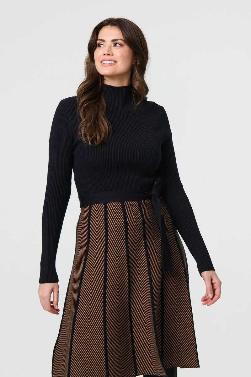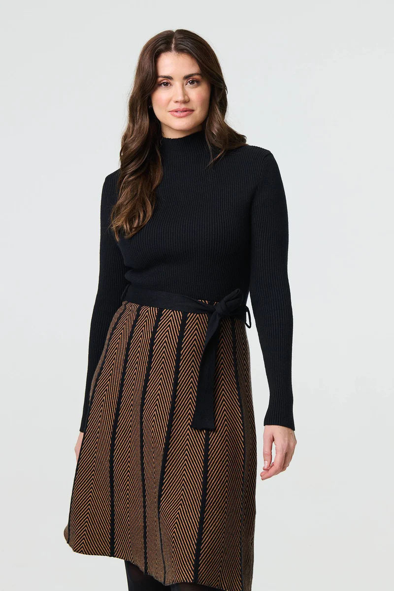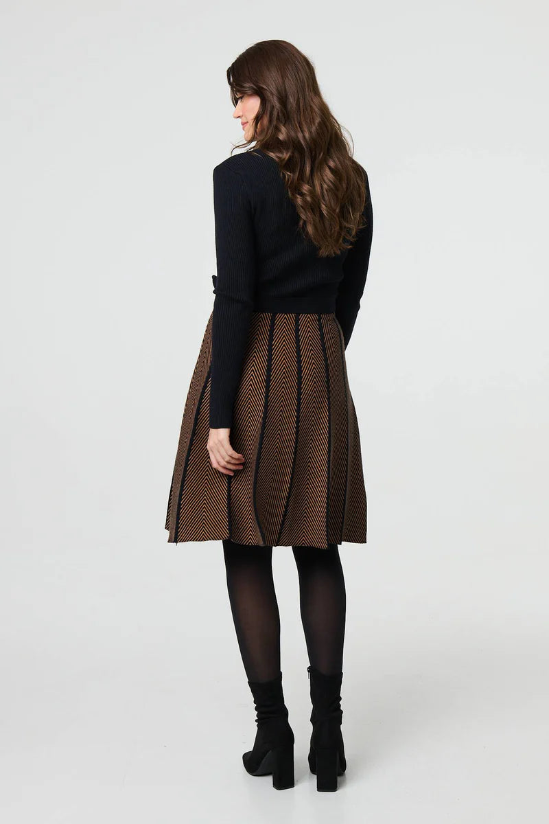Elegant. Effortless. Elevated. The Kara Stripe Knit Dress is a refined wardrobe essential that blends cozy sophistication with standout design. Featuring a figure-flattering ribbed black knit bodice and a flowy A-line skirt with bold tan and black chevron stripes, this dress offers a modern twist on classic silhouettes.