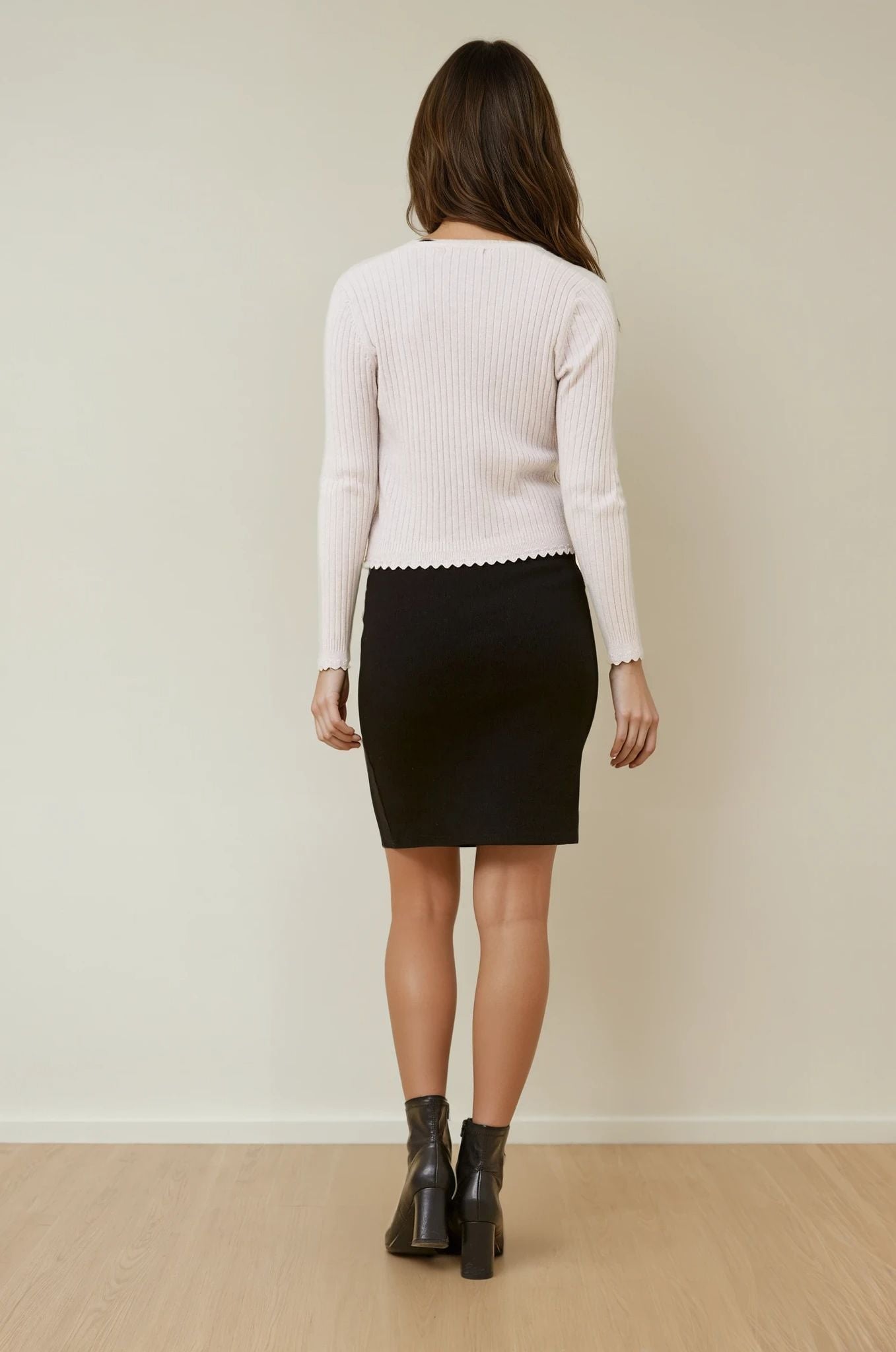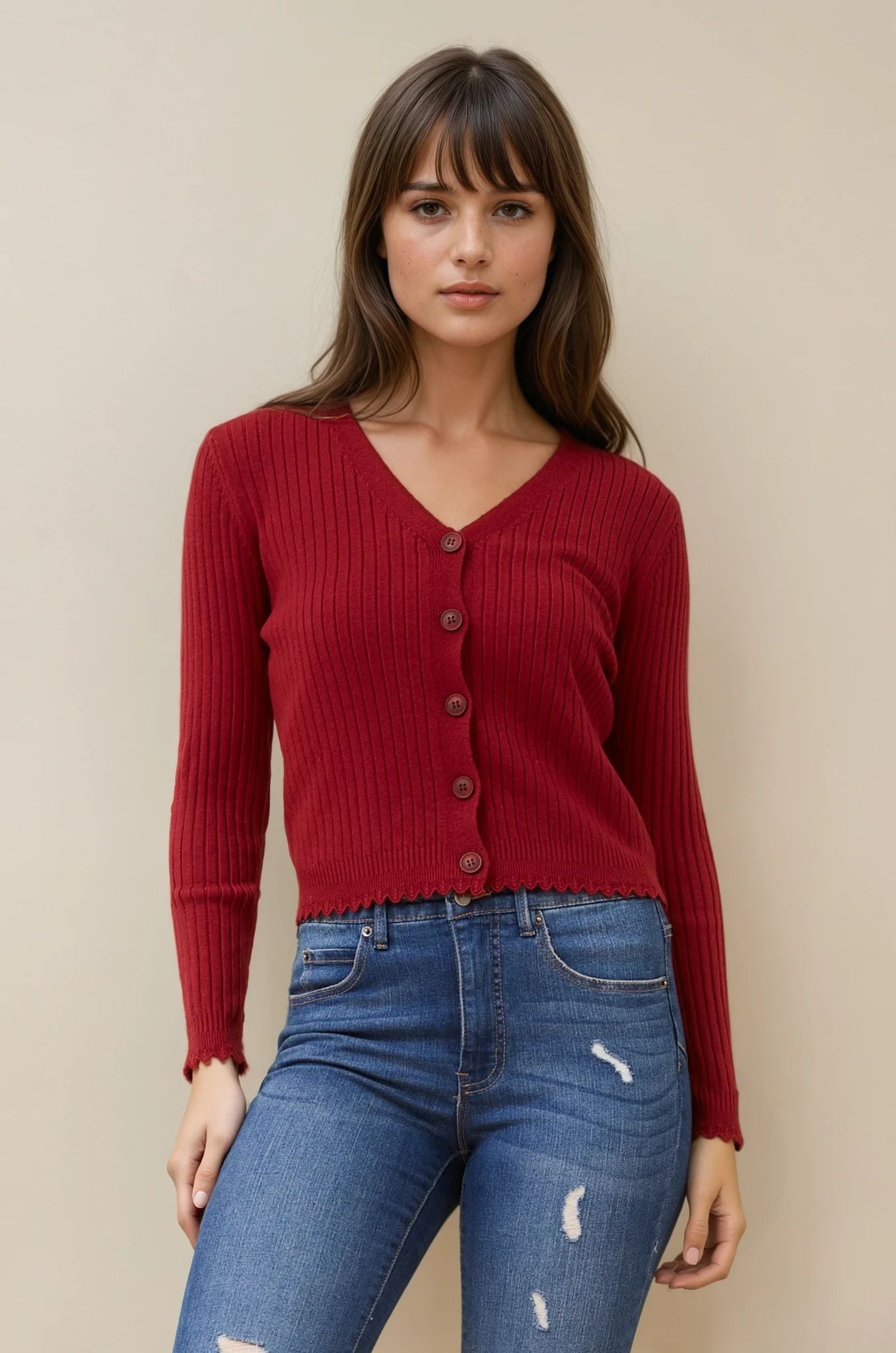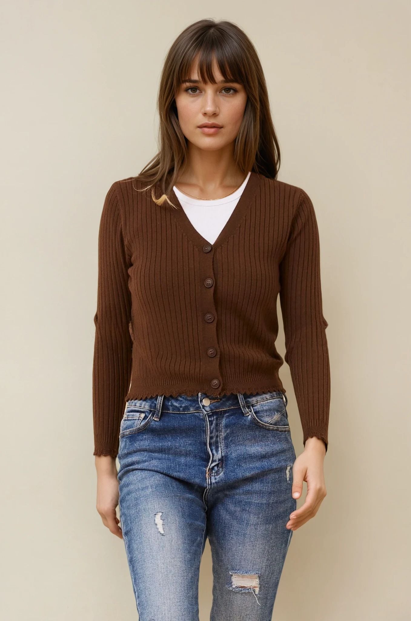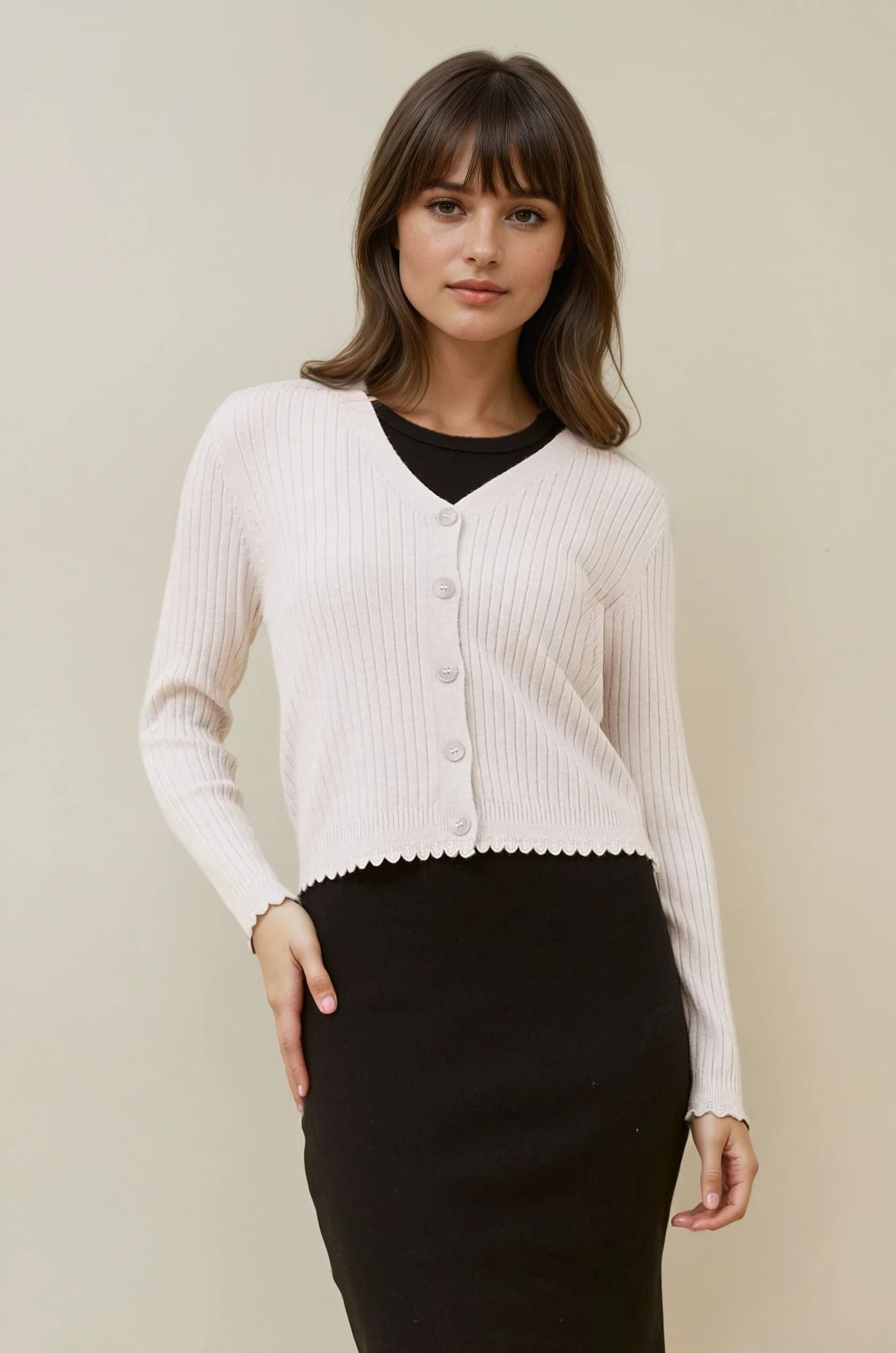 The Luxe Scallop Knit Cardigan is the perfect piece to pair with jeans, skirts, or dresses for a chic, everyday look that never goes out of style.