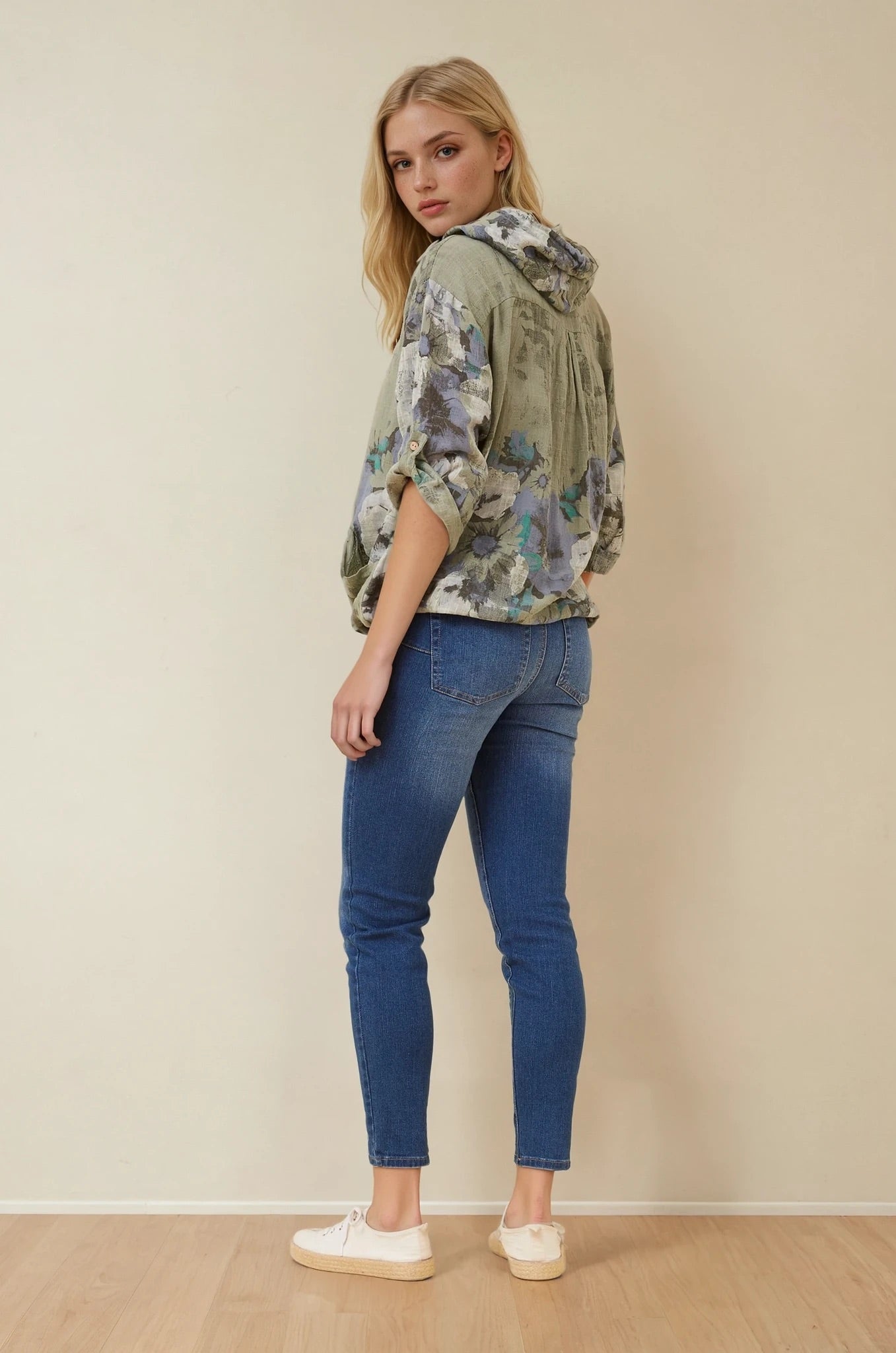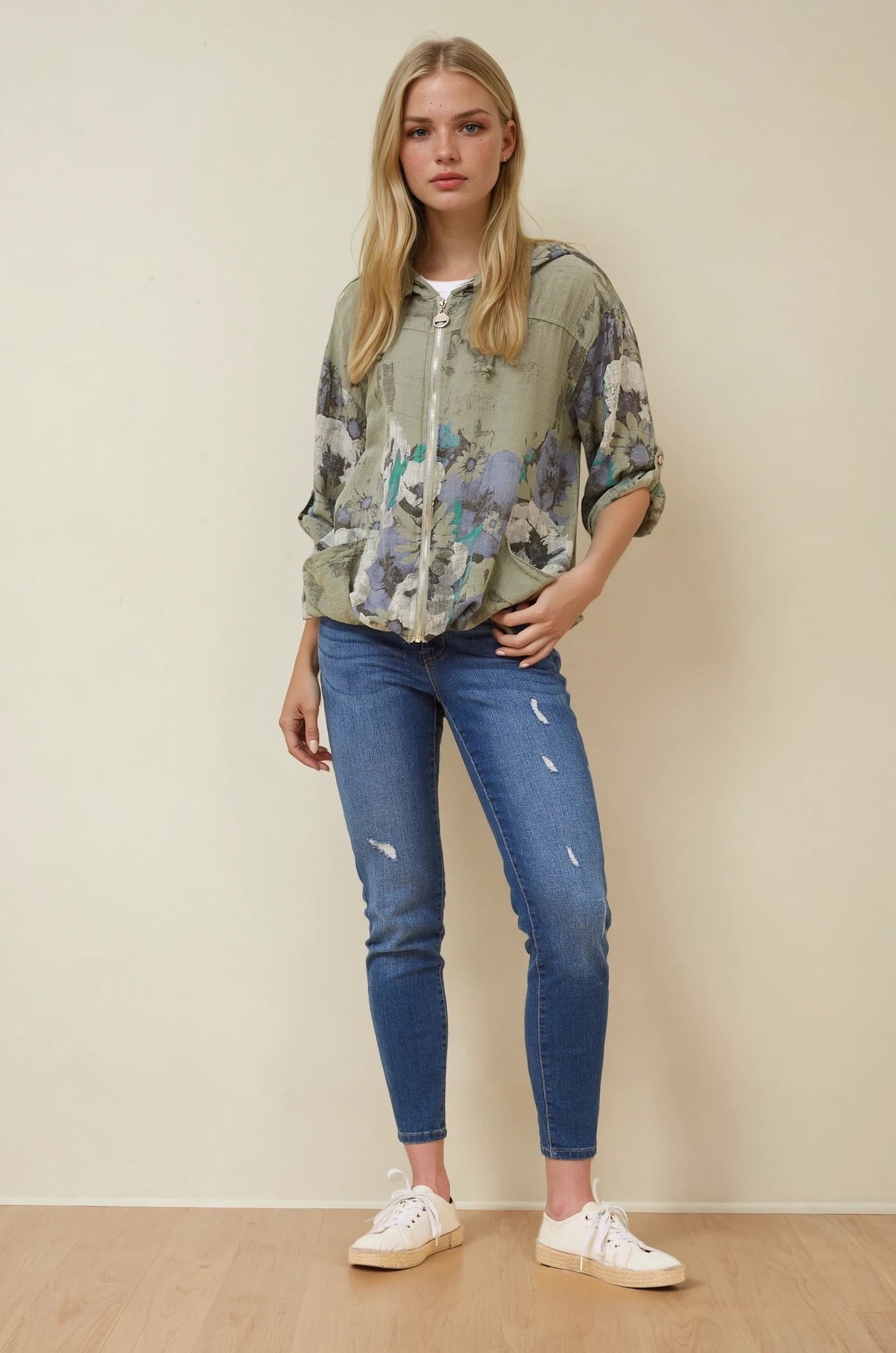 Lightweight and breathable, this hoodie-style jacket is ideal for transeasonal wear. The zip front makes it easy to throw on and go, while the hood and adjustable rolled sleeves add a relaxed, weekend-ready vibe. Its airy silhouette flatters without clinging, making it the perfect match for denim, flowy skirts, or your favorite lounge pants.
