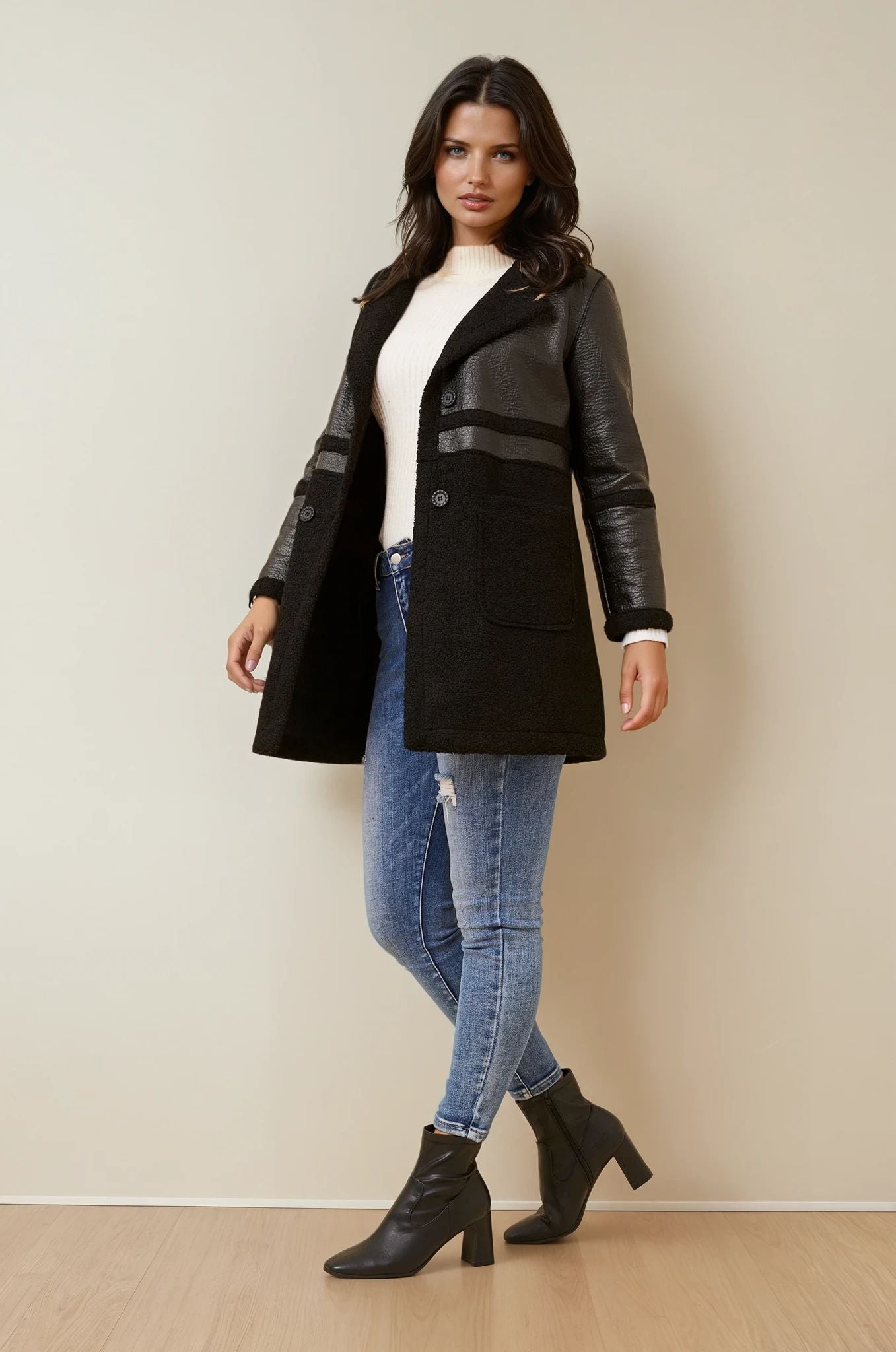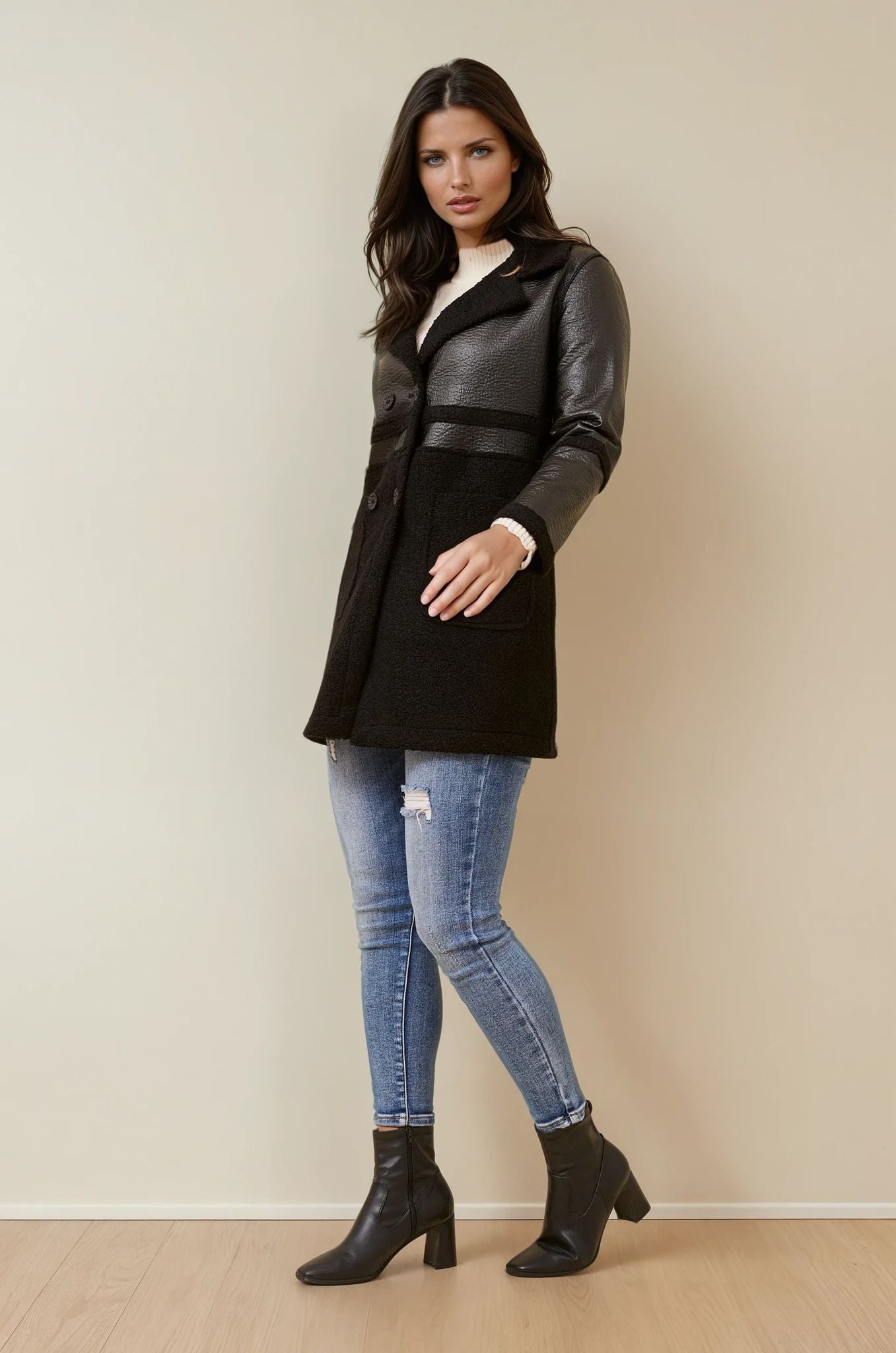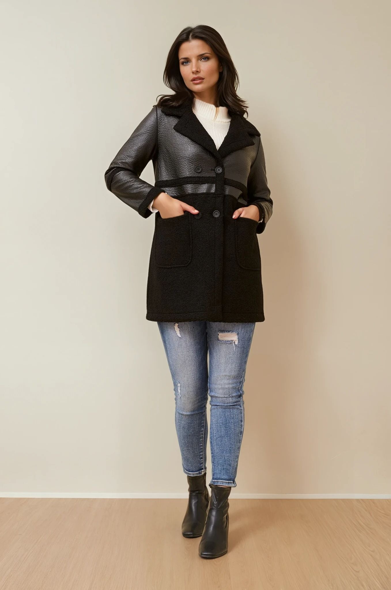 The structured lapel collar and double-breasted buttons give it a timeless tailored feel, while the dual-fabric contrast keeps it fresh and fashion-forward. From day errands to night outings, this coat layers effortlessly over jeans, knits, or your favorite winter dress — adding a polished edge with every step.