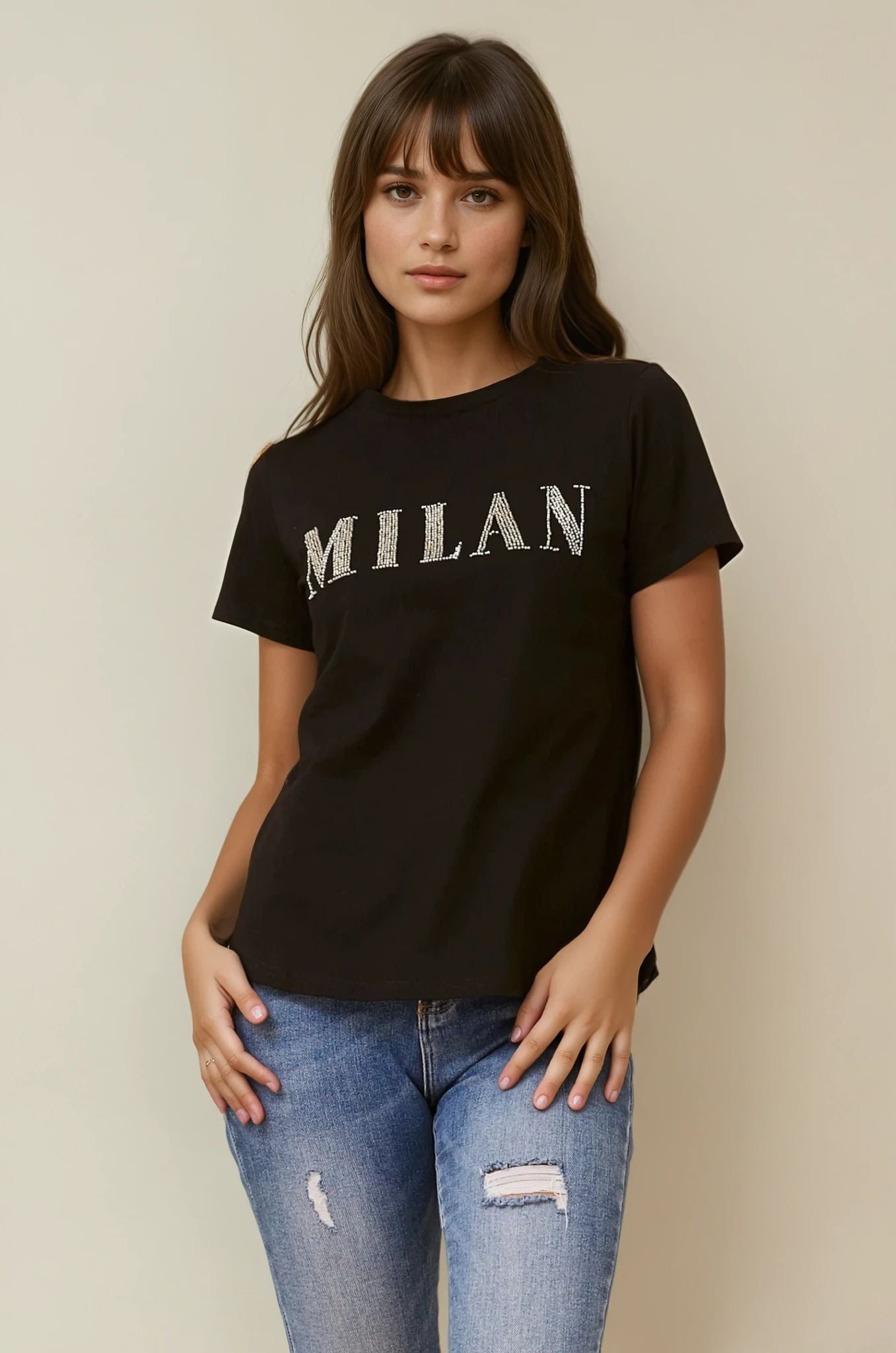 Upgrade your everyday wardrobe with the Jodelle Sparkle Tee – where casual meets chic! This versatile tee features a relaxed fit and a touch of glam with the dazzling "Milan" beaded detail that instantly elevates your look. Whether you’re layering it under a jacket or rocking it solo, this tee effortlessly pairs with jeans, shorts, or skirts for a stylish, laid-back vibe. Finish the look with your favorite runners for that cool, carefree appeal.
