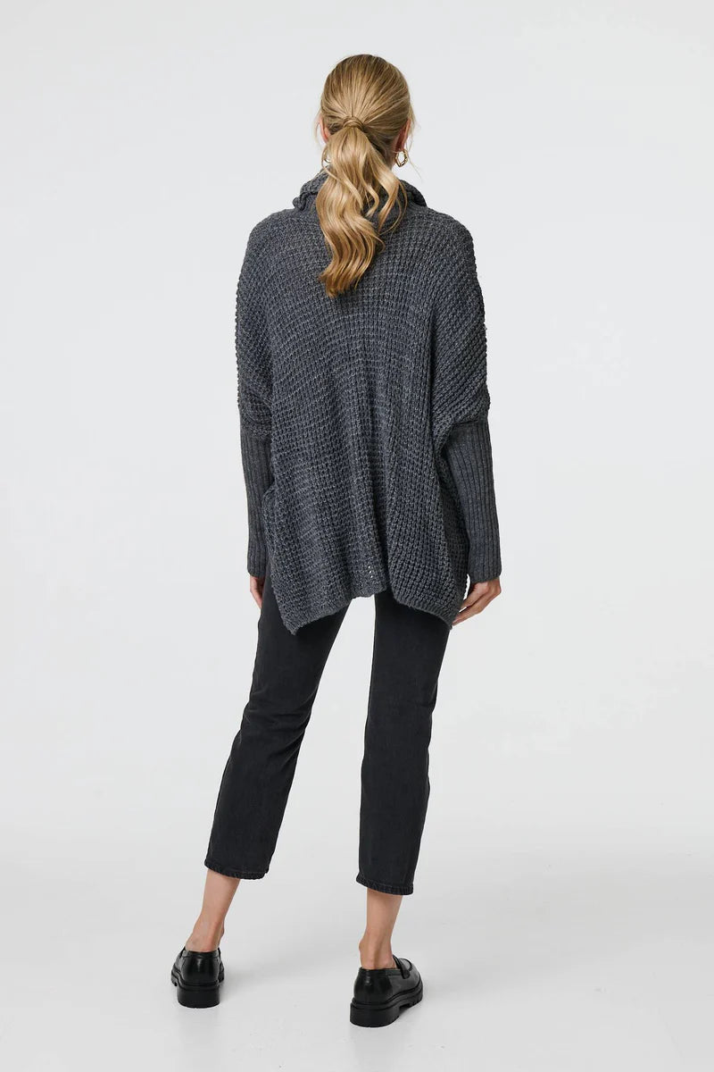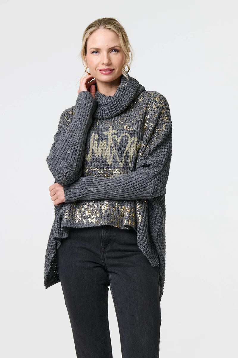 Wrap yourself in warmth and a little shimmer with the Miranda Cowl Neck Sweater. This charcoal-toned knit features a relaxed silhouette with ribbed sleeves and an oversized cowl neckline for ultimate comfort. Gold foil accents and a subtle script design across the front add a touch of glam, making it perfect for those who like their coziness with a side of sparkle.