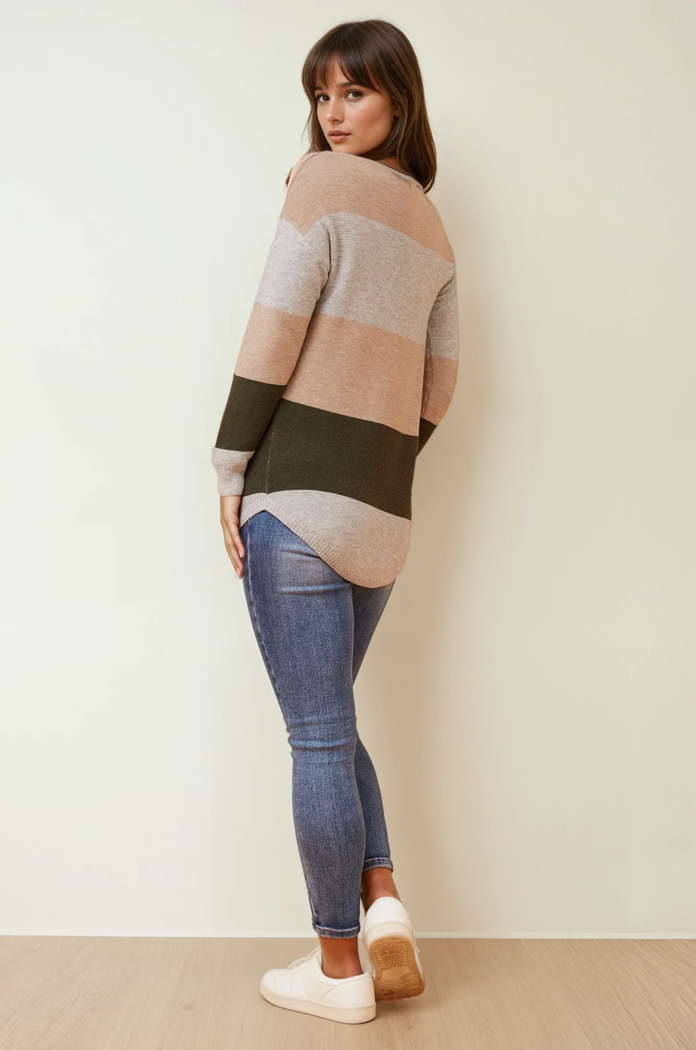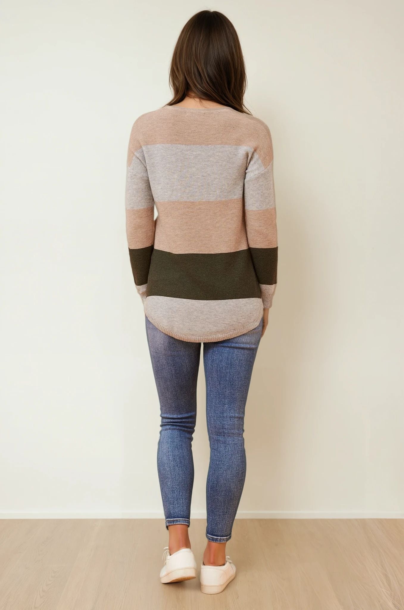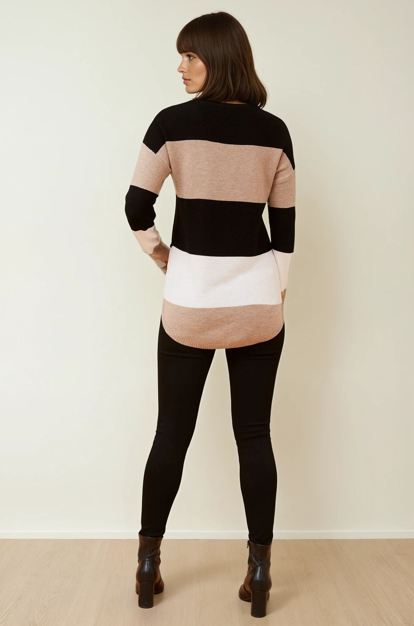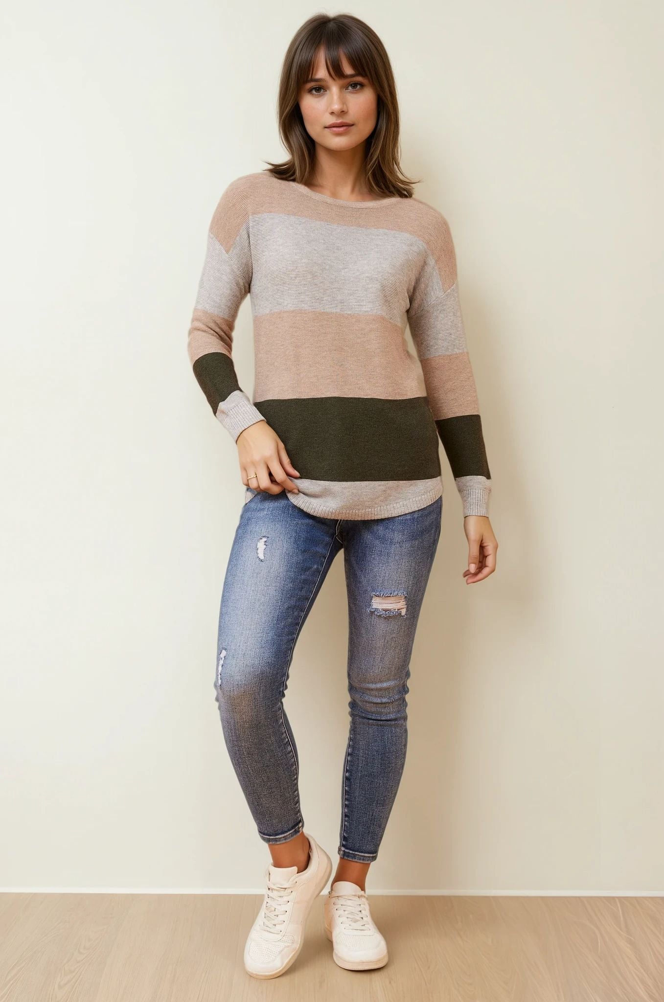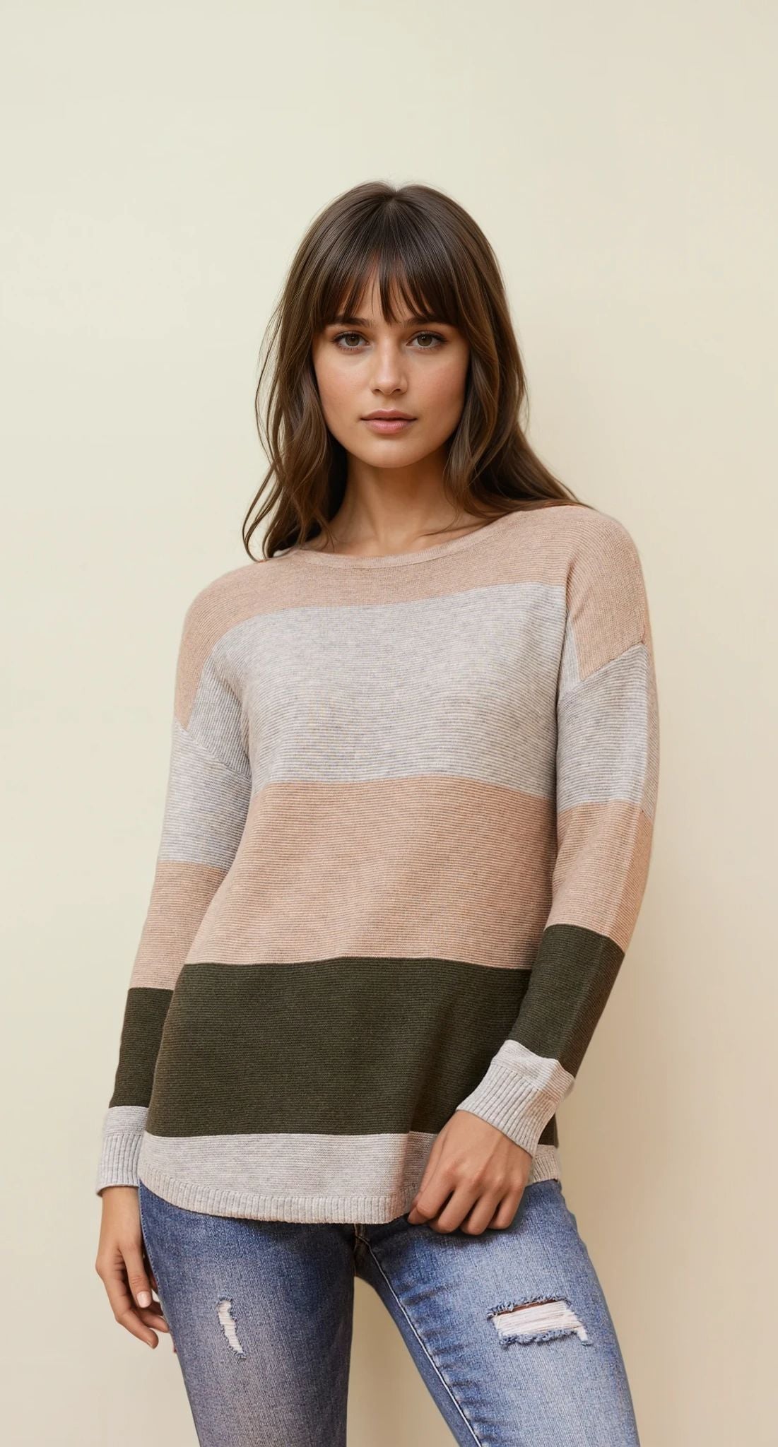 With a flattering crew neckline, long sleeves with trendy dropped shoulders, and ribbed cuffs and hem, this jumper combines comfort with style. The bold color block and stripe prints add an instant pop of energy, making it a standout piece you’ll love to wear again and again. The curved hi-low hem gives it a modern, relaxed fit that’s perfect for any occasion.