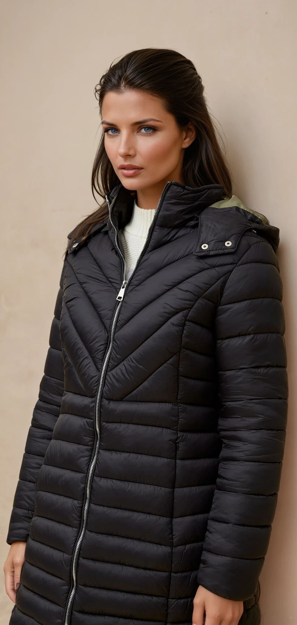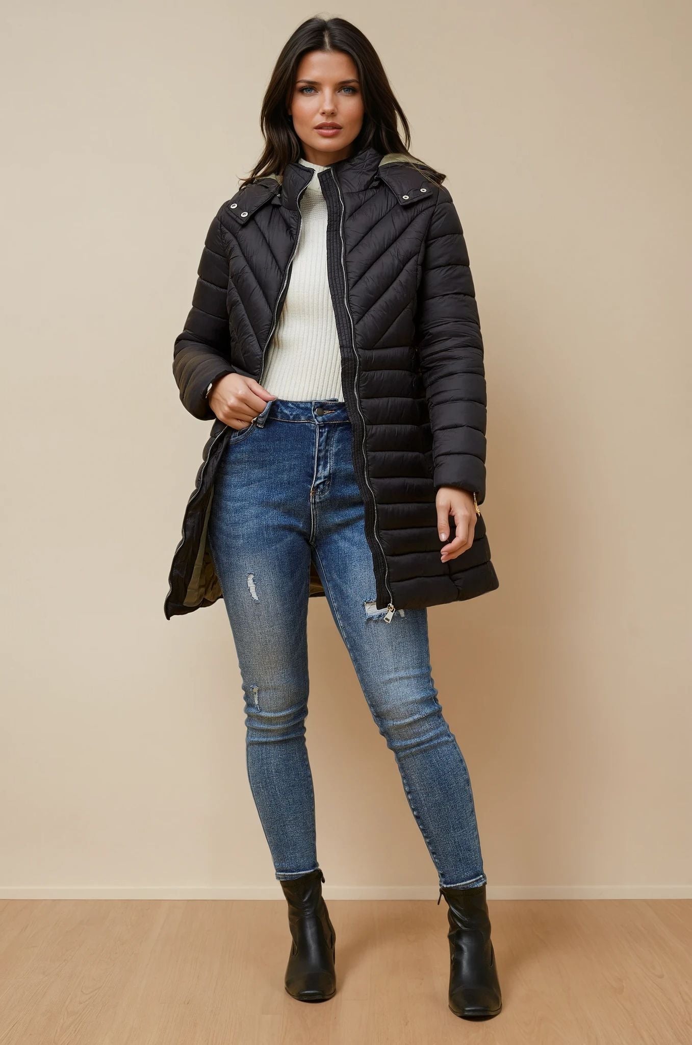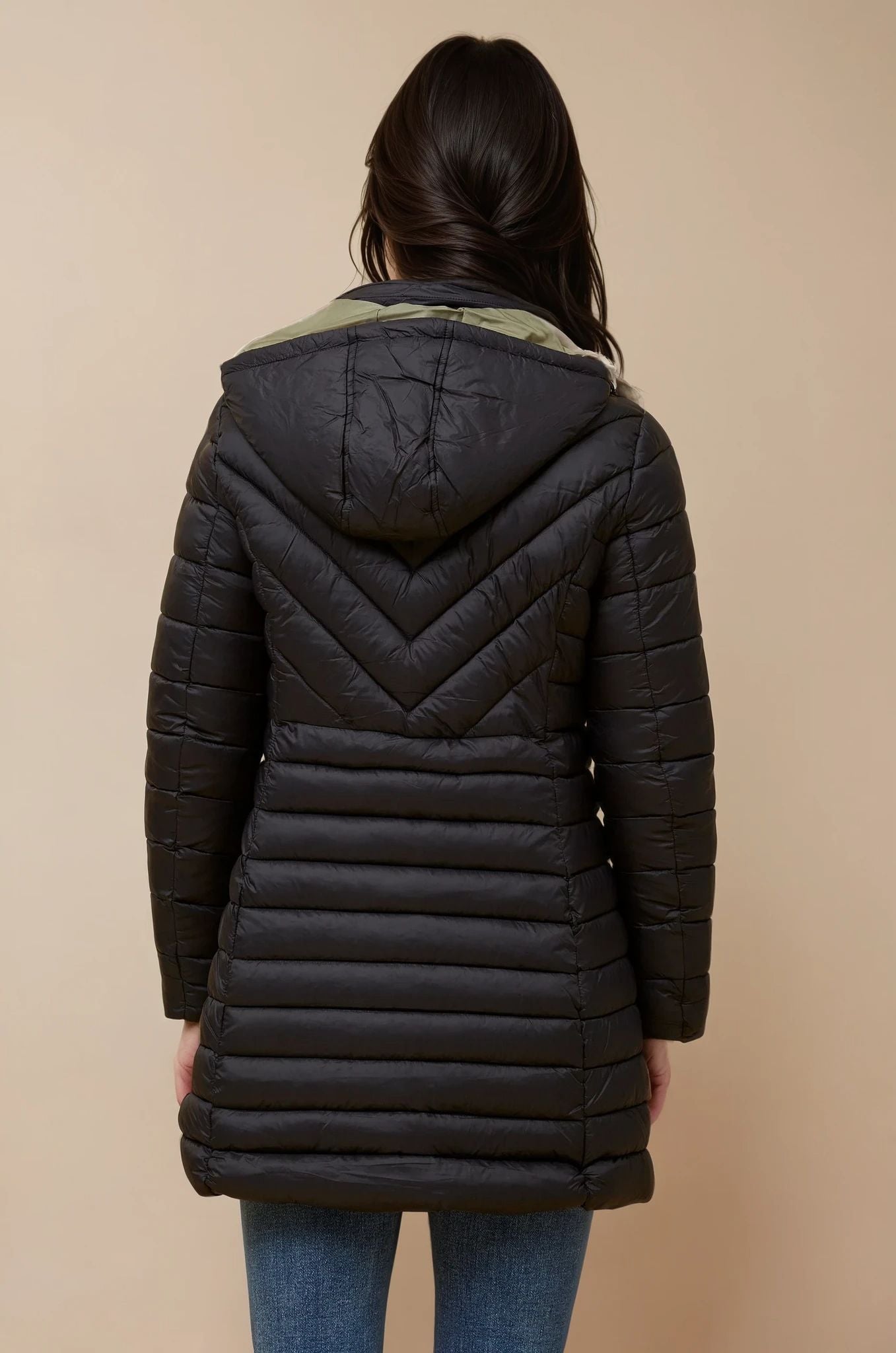 Chevron and horizontal quilted stitching for a flattering silhouette