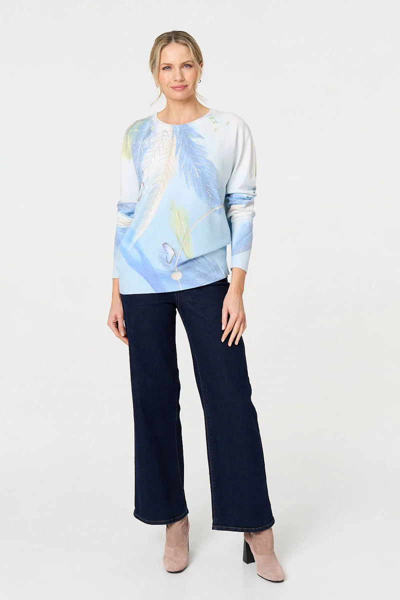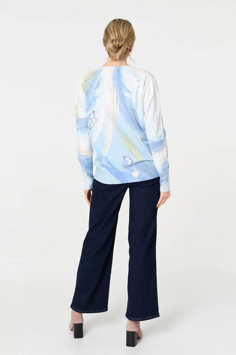 Float through your day in the Talia Feather Knit, where dreamy design meets everyday comfort. This serene blue pullover features an ethereal feather and butterfly print, kissed with delicate crystal embellishments that shimmer gently in the light.