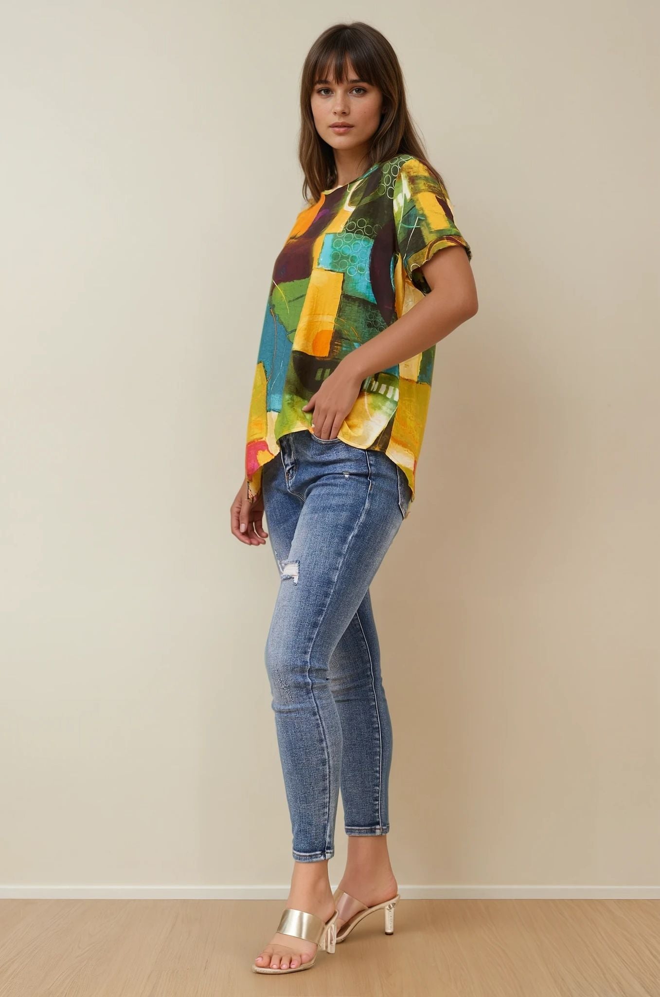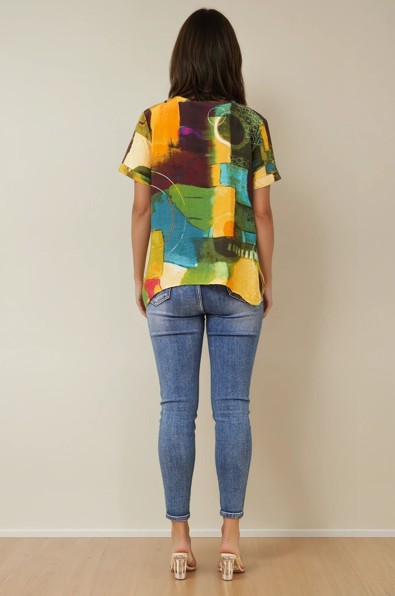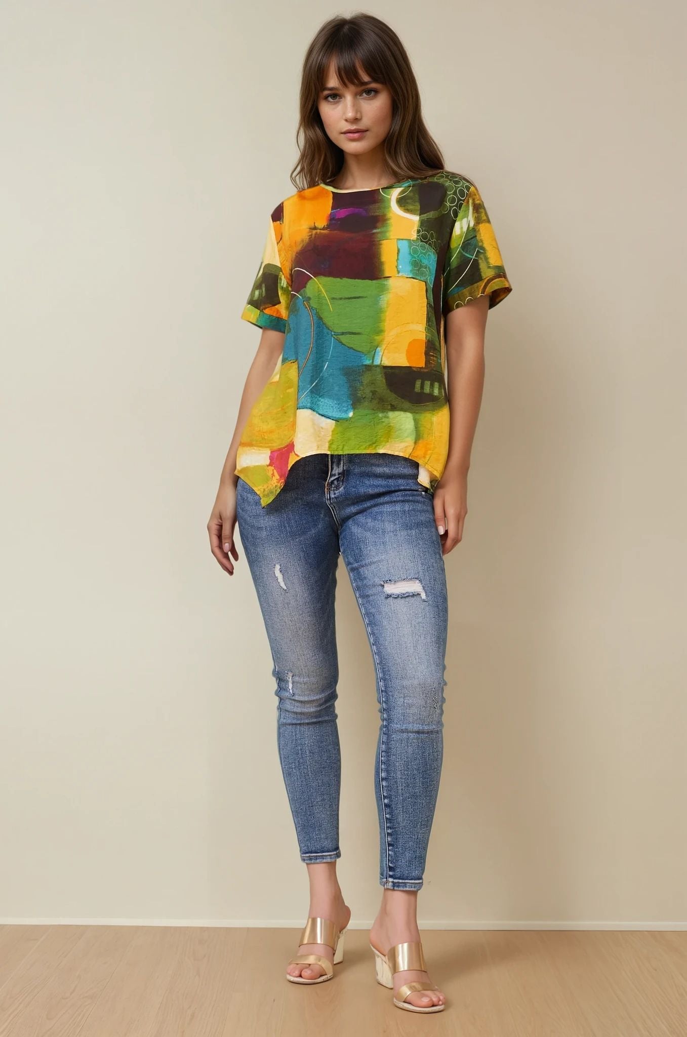 Bring a pop of personality to your wardrobe with the Zara Abstract Flow Top! This vibrant and bold piece showcases an eye-catching abstract print that instantly livens up any outfit. Designed for those who love playful fashion, it features a round neckline and short sleeves for effortless wear. The asymmetrical hem adds a unique touch, giving you a stylish silhouette with a carefree vibe. Pair it with jeans or shorts for a fresh, fun look that’s perfect for any casual outing!